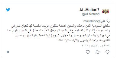 وقال مجتهد في تغريدات له أمس الاثنين: "ابن سلمان كان يريد إبقاء اليمن موحدا في بداية الحرب حين كان يظن أن الحرب لن تستغرق سوى أسبوعين وينهار الحوثي، لكنه حيث فشل فشلا ذريعا غير موقفه ولم يعد له تحفظ على فصل الجنوب، بل تمكن ابن زايد من إقناعه بالتفرغ للشمال وترك الجنوب له، لكنه اصطدم بعوائق وضعته في مأزق كبير".