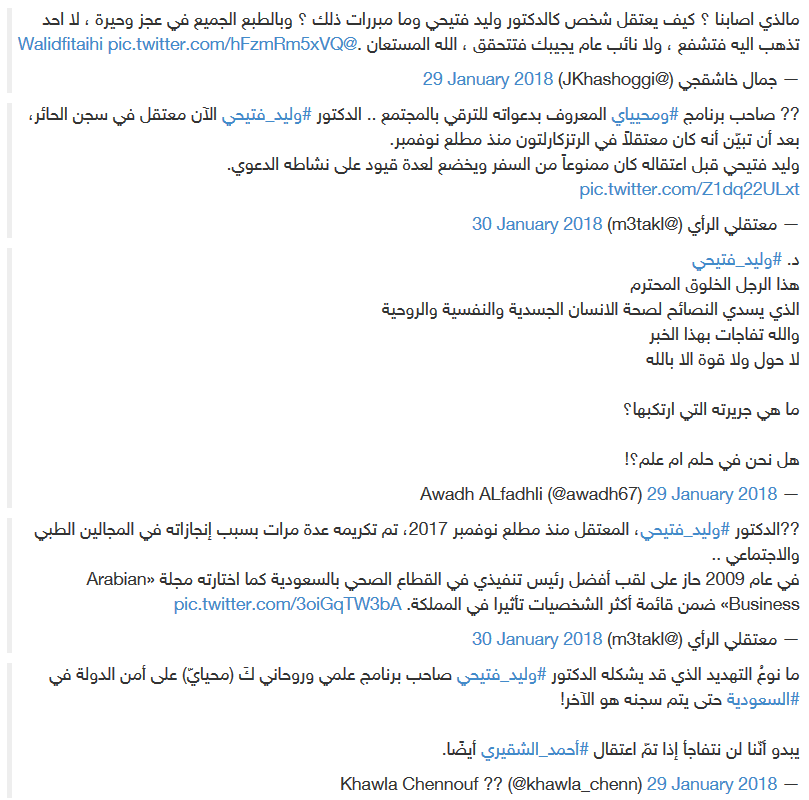 وتساءل الكاتب جمال خاشقجي: "ما الذي أصابنا؟ كيف يعتقل شخص كالدكتور وليد فتيحي وما مبررات ذلك؟ وبالطبع الجميع في عجز وحيرة، لا أحد تذهب إليه فتشفع، ولا نائب عام يجيبك فتتحقق، الله المستعان".