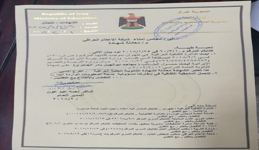 ذكر كتاب صادر عن المديرية العامة للتقويم والامتحانات في الوزارة الى مجلس أمناء شبكة الاعلام ان "الدائرة الثقافية العراقية في طهران وإستناداً الى كتاب وزارة الخارجية الايرانية بتاريخ 31/1/2018، بأن وزارة التربية والتعليم الايرانية أيدت حصول الطالب {مجاهد أبو الهيل بدر الجابري} على شهاد الثانوية العامة للعام الدراس 2001 – 2002، لذا تعتبر الشهادة معادلة لشهادة الثانونية العامة العراقية/ الفرع الأدبي". وأشار الى ان "الملحقية الثقافية في سفارتنا تتحمل مسؤولية صحة المعلومات الواردة للوزارة"