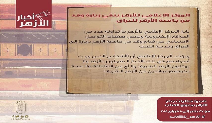 وكانت عدد من وسائل الإعلام العراقية قد نشرت خلال الأيام الماضية، أنباءً عن زيارة وفد من علماء جامعة الأزهر في مصر، مرقد الامام علي بن أبي طالب في العراق.
