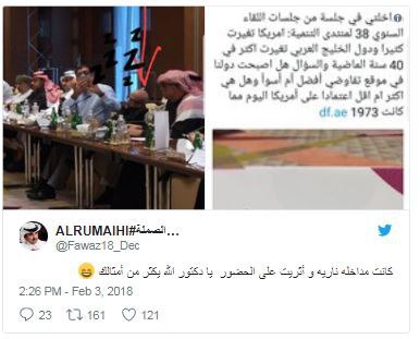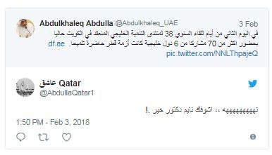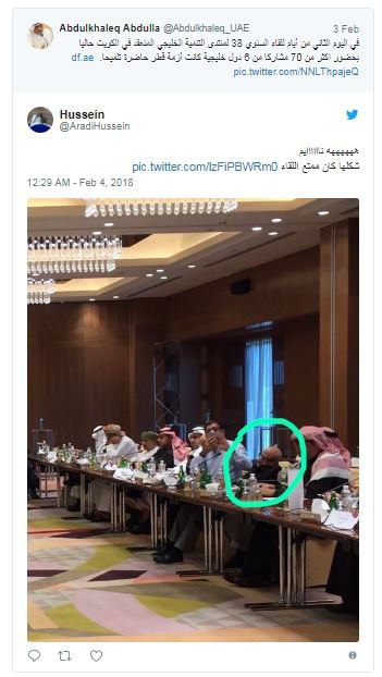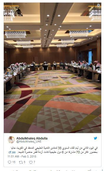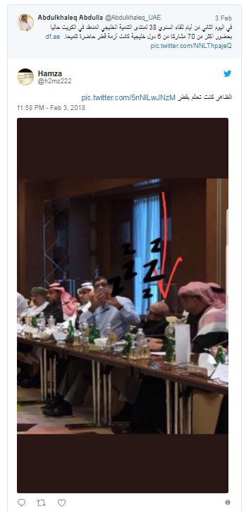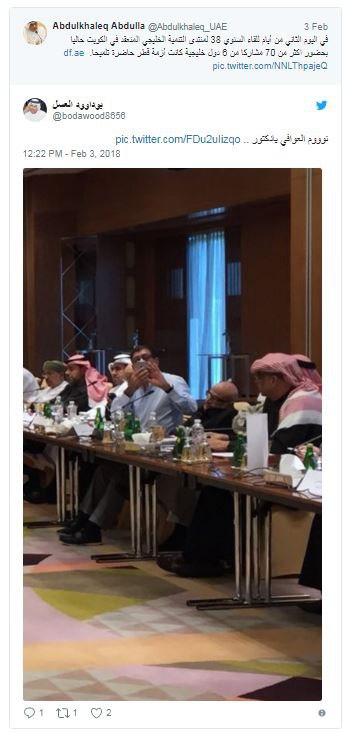 وعلى ما يبدو ان “عبد الخالق” لم ينتبه لنفسه في الصورة حتى أقدم على نشرها بنفسه على موقع “تويتر” لمجرد أن يذكر اسم قطر، معلقا عليها بالقول: ” في اليوم الثاني من أيام للقاء السنوي 38 لمنتدى التنمية الخليجي المنعقد في الكويت حاليا بحضور اكثر من 70 مشاركا من 6 دول خليجية كانت أزمة قطر حاضرة تلميحا”.