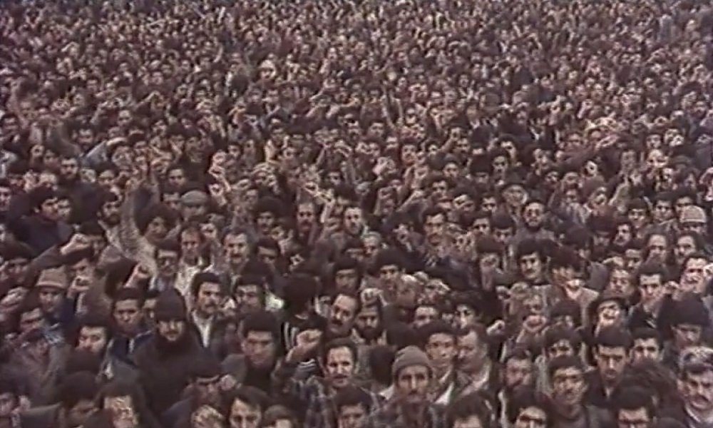 تظاهرات الشعب الإيراني خلال الثورة الإسلامية في إيران، والهتافات تصدح باسم الإمام الخميني، فيما تحوم طائرات الشاه المخلوع فوق رؤوس المتظاهرين لإرعابهم.