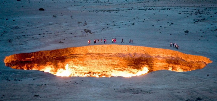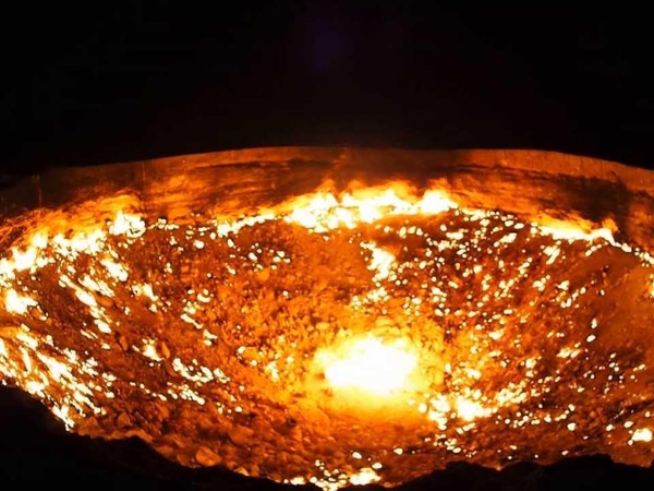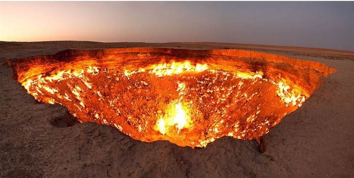 وفي قلب صحراء كاراكوم في تركمنستان تقع حفرة تشبه المحرقة بحجم ملعب كرة القدم لا تنطفئ نارها منذ أكثر من 50 عاما، وأطلق السكان المحليون على الحفرة اسم "باب جهنم"، وتعرف عالميا باسم حفرة "دار فازا".