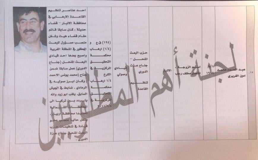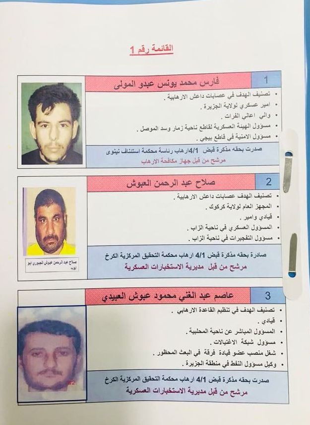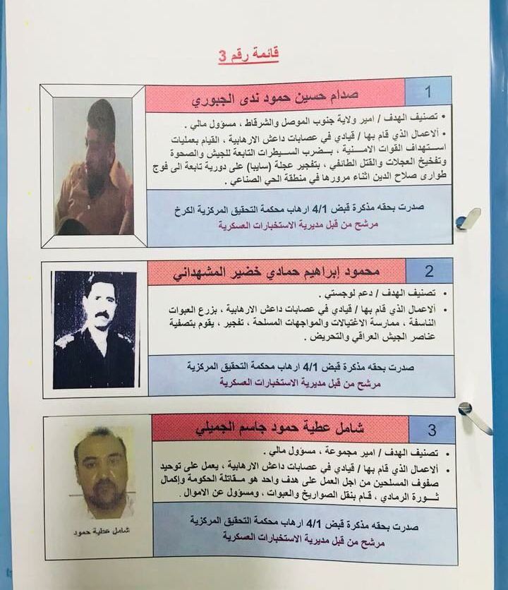 وضمت القائمة صدام حسين حمود الجبوري، وهو "أمير" ولاية جنوب الموصل والشرقاط، وكذلك محمود إبراهيم المشهداني الضابط السابق في نظام صدام.