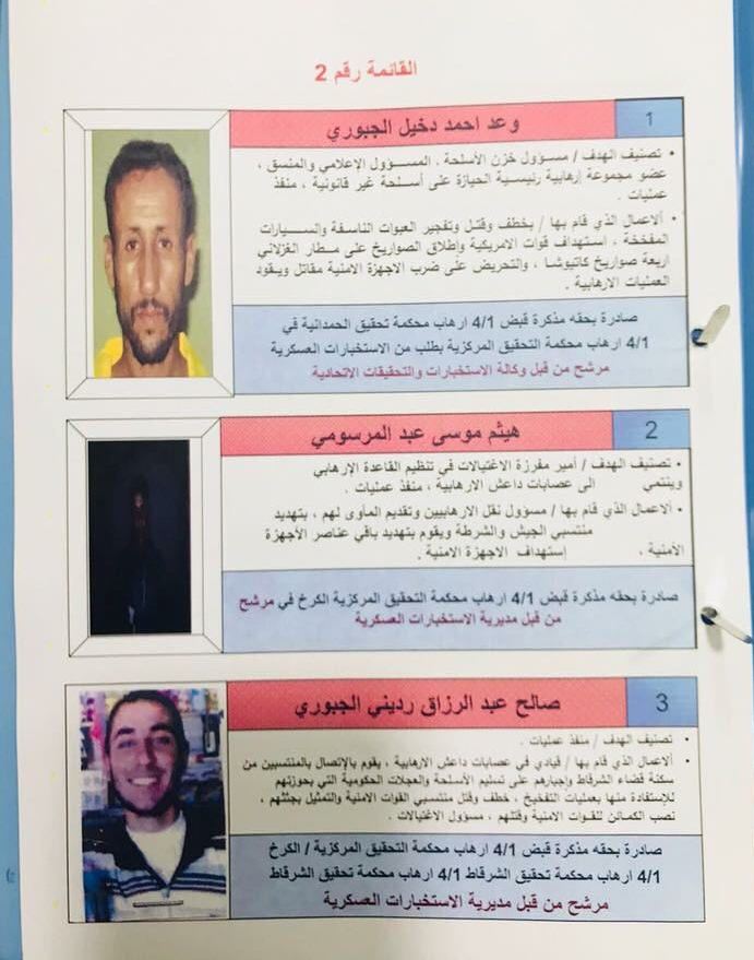 هذا وشملت القائمة "أمراء" ومسؤولي قواطع وممولين وداعمين ومنفذي اغتيالات وتفجير عبوات ناسفة، ما زالوا فارين.