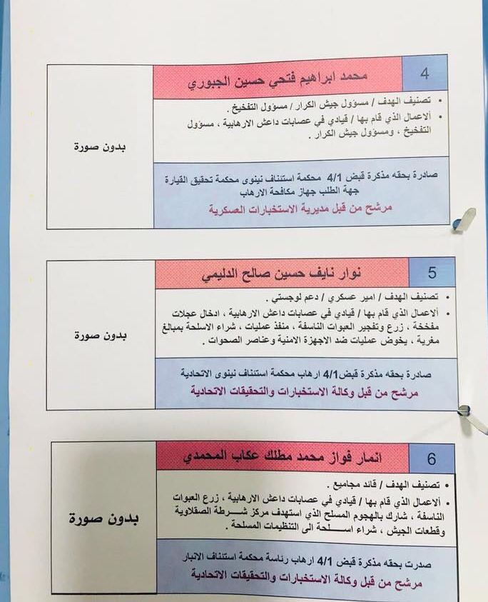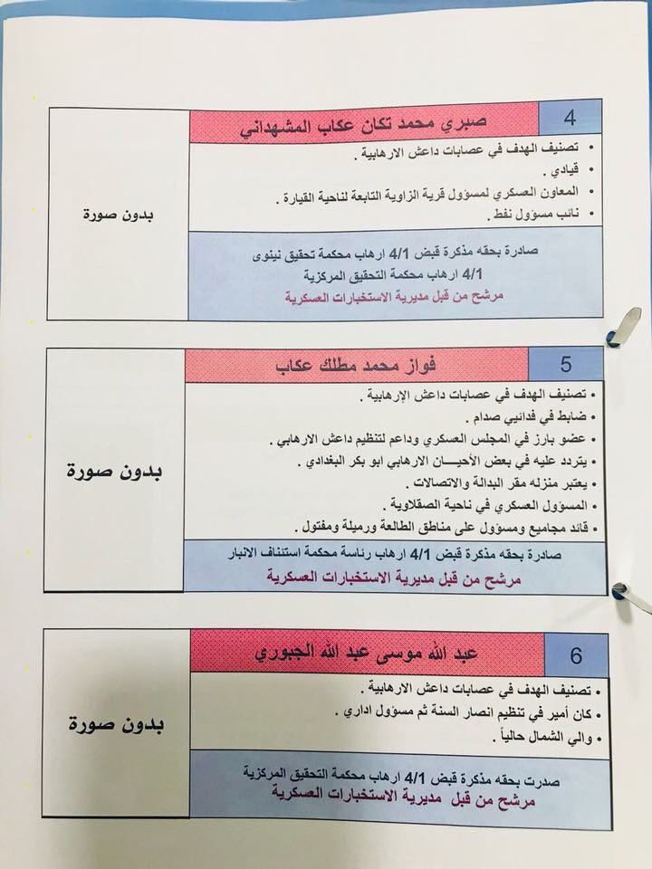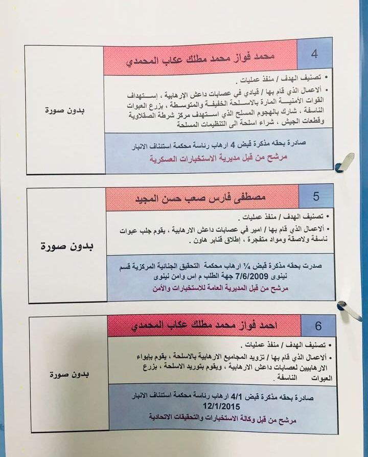 وضمت الأسماء الأخرى: 28 من كوادر تنظيم "داعش"، و12 من قادة تنظيم القاعدة، و20 من قادة حزب البعث المنحل، الذين انخرطوا في التنظيمات الإرهابية، كما نشرت صور بعضهم.