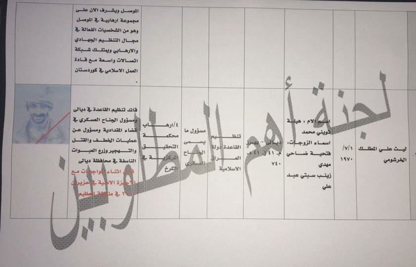 ومن هؤلاء فارس محمد يونس المولى، المشار إليه على أنه "والي أعالي الفرات"، ومسؤول الهيئة العسكرية لقاطع ناحية زمار وسد الموصل، إضافة إلى صلاح عبد الرحمن العبوش "المجهز العام لولاية كركوك، والمسؤول العسكري لولاية الزاب".