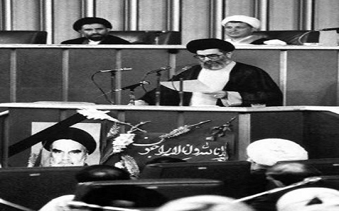 "بعد تقديم مجلس الخبراء التعازي برحيل إمام الأمَّة وقائد الجمهوريَّة الإسلاميَّة في إيران ومؤسِّسها، ومع الإدراك العميق لمسؤوليَّته التاريخيَّة، بالنظر للموقع الرفيع والحسَّاس لمنصب القيادة في نظام الجمهوريَّة الإسلاميَّة في إيران، ومع الاهتمام البالغ الّذي أولاه سماحة إمام الأمَّة ومؤسّس الجمهوريَّة الإسلاميَّة في إيران (رضوان الله تعالى عليه) في نداءاته وبياناته المتكرّرة، وخاصة أوامره وإرشاداته بشأن القيادة، وبالنظر للأسس المتعلّقة بالدستور، ومع الإحساس الكامل بمؤامرات الخنَّاسين وأعداء الإسلام في الداخل والخارج تجاه مستقبل النظام الإسلاميّ المقدّس. ومن أجل الاستعداد اللازم لمواجهة أيَّة حادثة. وبالنظر للظروف الداخليّة والخارجيّة. وباستلهام المضامين الربَّانيَّة الرفيعة لوصيّة سماحة إمام الأمّة الإلهيَّة السياسيَّة المهمَّة جدًّا. فإنَّه (أي: مجلس الخبراء) انتخب في اجتماعه الطارئ، المنعقد بتاريخ 14/3/86هـ.ش سماحة آية الله السيّد عليّ الخامنئيّ لقيادة نظام الجمهوريَّة الإسلاميَّة في إيران بأكثريَّة أربعة أخماس الأعضاء الحاضرين. 60 صوتًا مؤيّدًا من 74 عضوًا حاضرًا".
