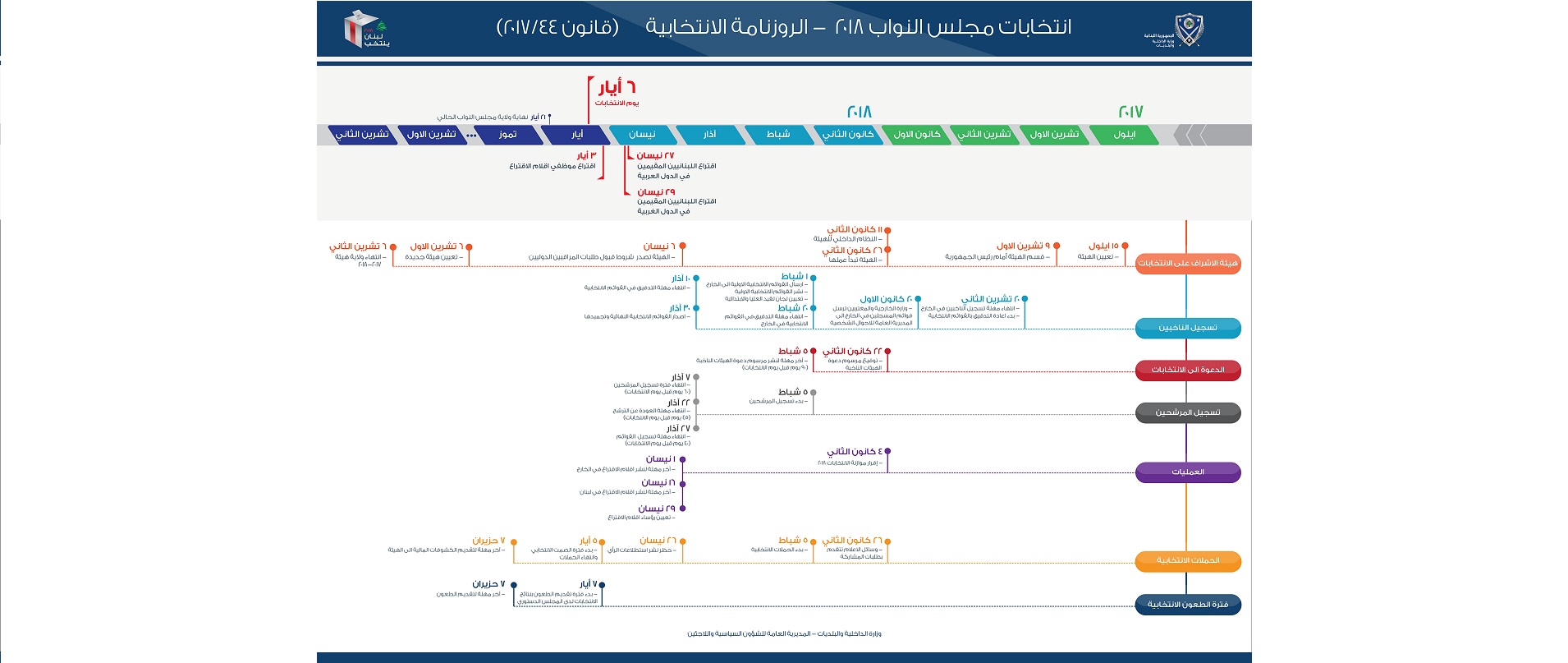 لبنان – الكوثر: نشرت وزارة الداخلية اللبنانية عبر موقع الانتخابات روزنامة الانتخابات النيابية للعام 2018 لتوضيح تاريخ العملية الانتخابية وفق القانون 44/2017.