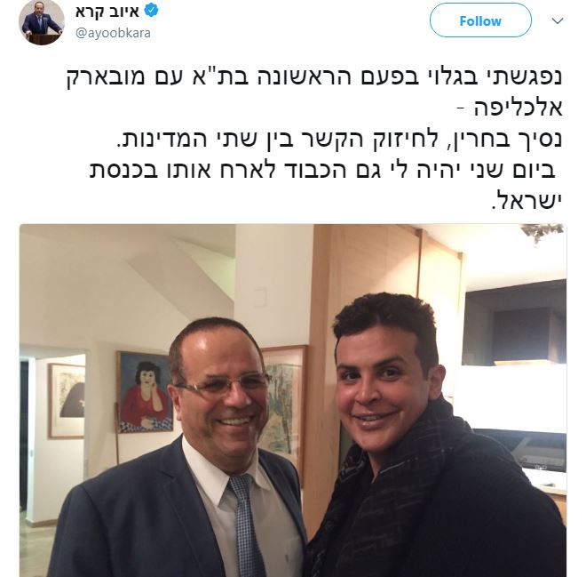 وأضاف قرا في تغريدة له على "تويتر"، أنها "المرة الأولى التي يجتمع فيها وبشكل علني مع الأمير البحريني"، مبينا أنه يتشرف في استضافته اليوم الإثنين في الكنيست الإسرائيلي.