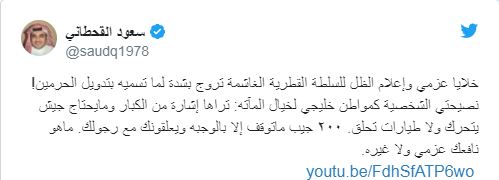 ودون “القحطاني” الشهير بـ”دليم” في تغريدة له عبر حسابه الرسمي بـ”تويتر” مستغلا مزاعم وافتراءات روجها ذبابه ضد قطر ما نصه:”خلايا عزمي وإعلام الظل للسلطة القطرية الغاشمة تروج بشدة لما تسميه بتدويل الحرمين! نصيحتي الشخصية كمواطن خليجي لخيال المآته: تراها إشارة من الكبار ومايحتاج جيش يتحرك ولا طيارات تحلق. ٢٠٠ جيب ماتوقف إلا بالوجبه”