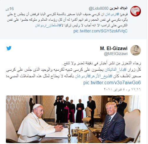 ولكن ما أثار انتباه المتابعين هو اختلاف الكرسي الذي جلس عليه الرئيس التركي، مقارنة بآخر جلس عليه شيخ الأزهر أحمد الطيب خلال زيارته البابا نوفمبر 2017، فقد كان كرسي الأخير أصغر من كرسي البابا، ليس كبيراً مثل كرسي أردوغان.