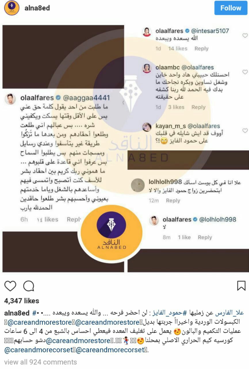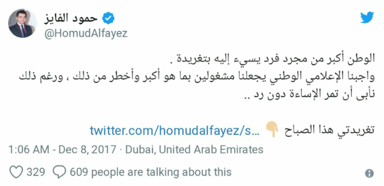 وكان الإعلامي حمود الفايز قد نشر نهاية العام الماضي تغريدات مهاجمة للإعلامية علا الفارس قال في إحداها إن “الوطن أكبر من مجرد فرد يسيء إليه بتغريدة. واجبنا الإعلامي الوطني يجعلنا مشغولين بما هو أكبر وأخطر من ذلك، ورغم ذلك، نأبى أن تمر الإساءة دون رد”.