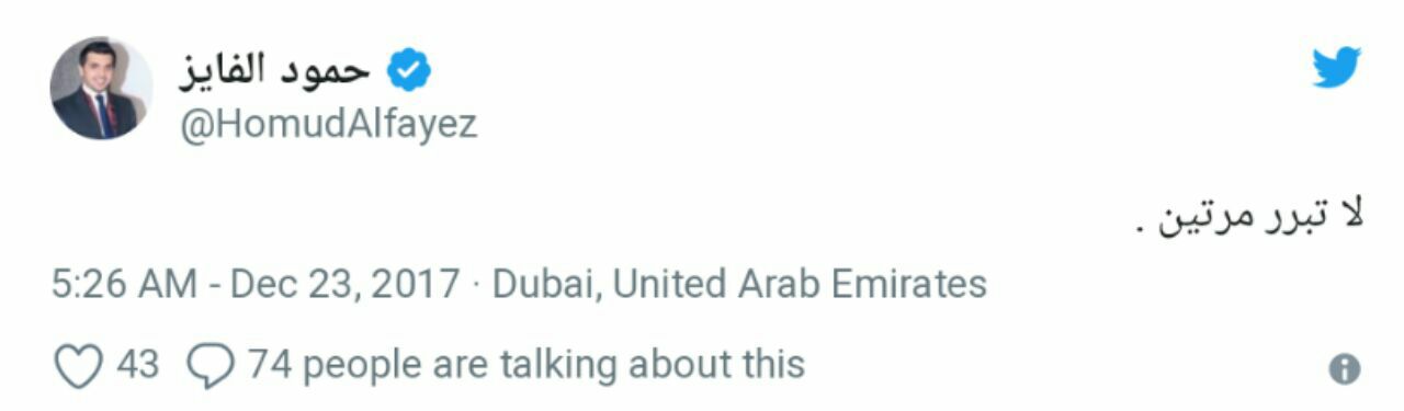 وأضاف في تغريدة أخرى ردا على توضيح علا الفارس مقصد تغريدتها التي فهمت أنها إساءة إلى السعودية، وتسببت بابتعادها لفترة عن قناة “إم بي سي”، مع تردد أنباء حينها عن فصلها من قبل إدارة القناة قائلا: “لا تبرر مرتين”.