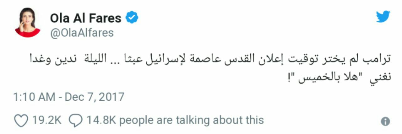 وتعبيرا عن غضبها لقرار الرئيس الامريكي دونالد ترامب اعترافه بالقدس عاصمة لإسرائيل، قالت” الفارس” في تدوينة لها قبل ان تحذفها وتعيد صياغتها: ” ترامب لم يختر توقيت إعلان القدس عاصمة لإسرائيل عبثا …فبعد زيارته لنا تأكد بأن العرب سيدينون الاعتراف الليلة ويغنون غدا “هلا بالخميس “!.