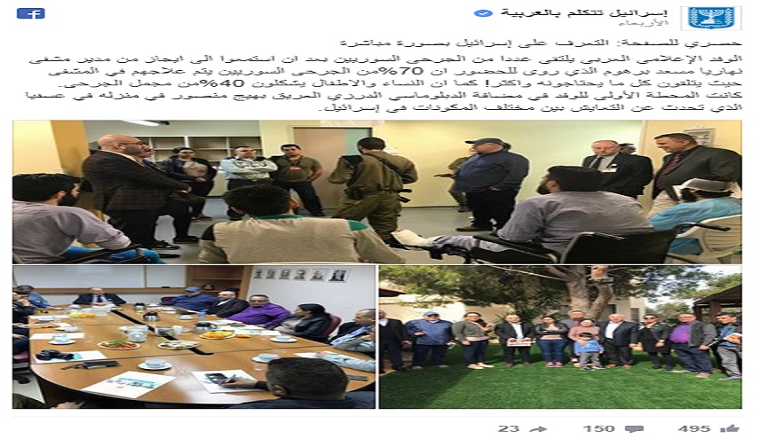 وظهر مدير المكتب الإعلامي في منصة أستانا في صور أخرى برفقة أدرعي، حيث قالت الصفحة الإسرائيلية إنهما كانا يزوران جرحى سوريين يتلقون العلاج في "إسرائيل".
