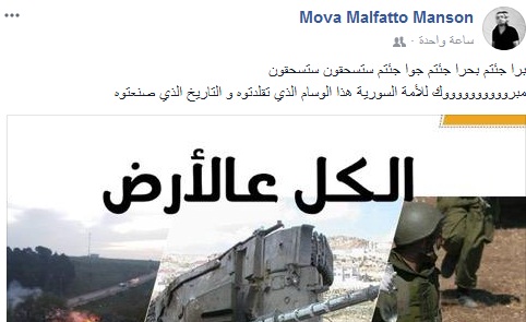 وسَخِرَت ناشطةٌ من الحكومةِ الإسرائيليّةُ بالقولِ "إسرائيلُ تبعثُ برسائلَ متطابقةٍ إلى روسيا وأمريكا تطالبُ بـ إيقافِ تصعيدِ الوضعِ في المنطقة"، مُشيرةً إلى أنَّ "سوريّةَ لنْ تُرسلَ اليوم رسائلَ مُتطابِقة إلى مجلسِ الأمنِ لتطالبَ بردعِ إسرائيلَ وإنّما رجالُ الجيشِ هُم مَنْ ردّوا عليها مباشرةً"، بحسبِ قولِ الناشطة.