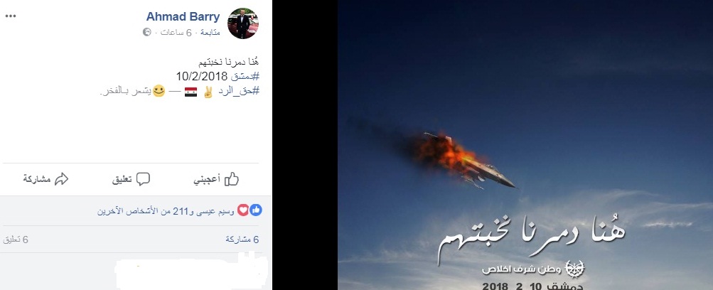 ورأى عددٌ من الناشطينَ أنَّ "إسقاطَ الطائرةِ مدعاةٌ للفخرِ؛ لأنّه أسقطَ وهماً وجبلاً من الافتراءاتِ والأكاذيبِ، بضربةٍ واحدةٍ، الجيشُ أسقطَ كلّ ذلك"، وكتبَ آخرون بأنّهم "ذاهبونَ للتسوّقِ في وقتٍ ينزلُ الصهاينةُ إلى الملاجئ".