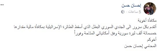 إلّا أنَّ فرحةَ أحد محامي سورية اختلفت بعضَ الشيء عن آخرينَ لأنّه أعلنَ عن عزمِهِ تقديم مكافأةٍ ماليّةٍ قدرها نصف مليون ليرة سوريّة للجنديّ السوريّ الذي أسقطَ الطائرةَ الإسرائيليّة، في حين ذكرَ ناشطونَ أنَّ عدداً كبيراً من المواطنينَ يقومونَ بتوزيعِ الحلوى في شوارعِ البلاد تعبيراً عن سعادتِهم بإهانةِ العدوّ الصهيونيّ.