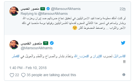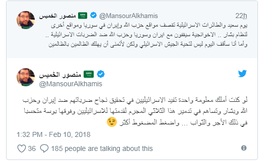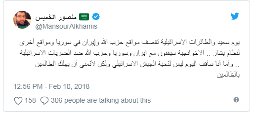 وقال “الخميس” في تدوينات له عبر حسابه بموقع التدوين المصغر “تويتر” رصدتها “وطن” معلقا على حادثة إسقاط الطائرة الإسرائيلية:” يوم سعيد والطائرات الاسرائيلية تقصف مواقع حزب الله وإيران في سوريا ومواقع أخرى لنظام بشار .. الاخوانجية سيقفون مع ايران وسوريا وحزب الله ضد الضربات الاسرائيلية .. وأما أنا سأقف اليوم ليس لتحية الجيش الاسرائيلي ولكن لأتمنى أن يهلك الظالمين بالظالمين”.