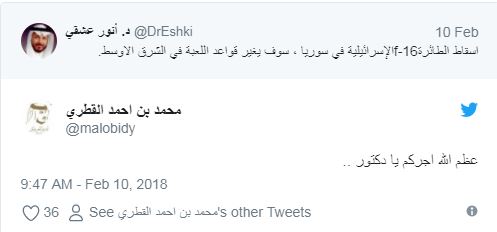 ودون في تغريدة له بتويتر عبر حسابه الشخصي رصدتها (وطن) ما نصه:”اسقاط الطائرةf-16الإسرائيلية في سوريا ، سوف يغير قواعد اللعبة في الشرق الاوسط.”
