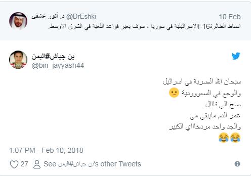 تغريدة “عشقي” الأولى والتي ظهر في ثنايها حزنه على إسقاط الطائرة الإسرائيلية، قوبلت بموجة من السخرية والتغريدات اللاذعة من قبل النشطاء.