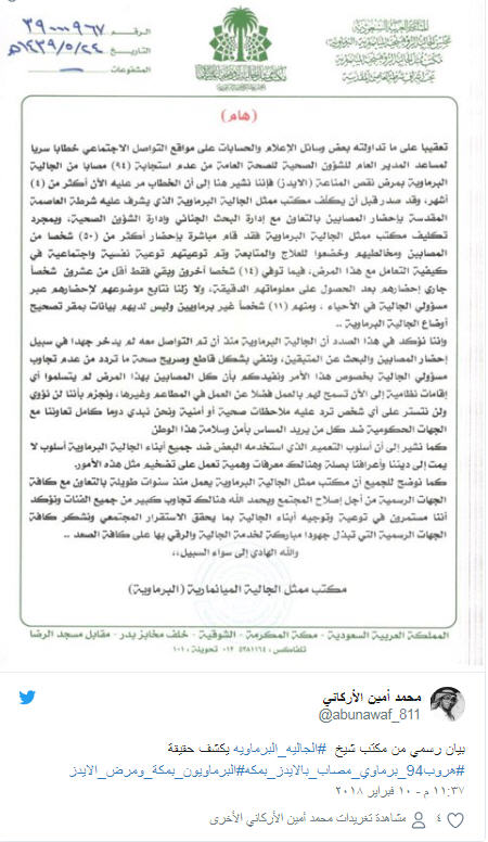وفي رد على هذه التقارير، قال مكتب ممثل الجالية البورمية إن “ما تم تداوله عن اختفاء 94 مصابًا بالإيدز، وعدم استجابتهم لاستدعاءات مستشفى الملك فيصل بمكة المكرمة، مضى عليه أكثر من أربعة أشهر”.