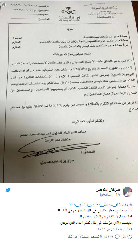 وأوضح المكتب في بيان، أن الخطاب السري المتداول لمساعد المدير العام للشؤون الصحية من عدم استجابة 94 بورميًا مصابًا بالإيدز للعلاج، مرّ عليه 4 أشهر، وقد صدر قبل أن يكلف مكتب ممثل الجالية البورمية بإحضار المصابين بالتعاون مع إدارة البحث الجنائي وإدارة الشؤون الصحية.