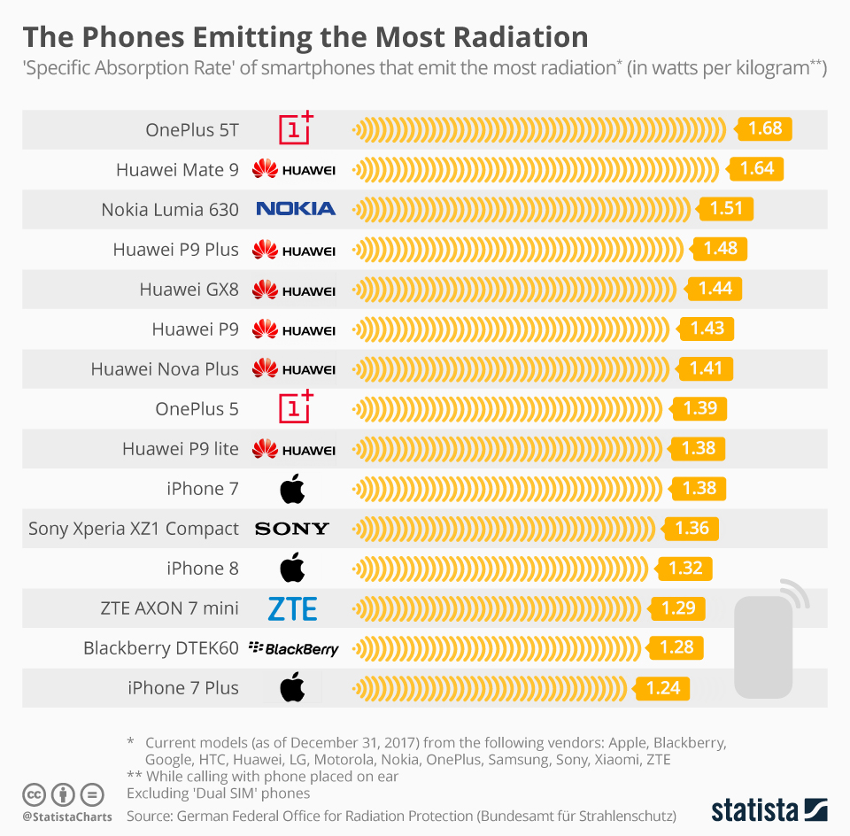 وقد رصد موقع statista الأمريكى المتخصص فى الأبحاث السوقية مجموعة من البيانات التى حصل عليها من المكتب الاتحادى الألمانى للحماية من الإشعاع، والذى يمتلك بدوره قاعدة بيانات شاملة للهواتف الذكية - الجديدة والقديمة - ومستوى الإشعاع الذى ينبعث من كل منها، ووفقا لهذه البيانات فإن الهاتف الذكى الحالى الذى يوفر أعلى قدر من الإشعاع هو هاتف "وان بلس 5T"، كما تضم القائمة مجموعة كبيرة من هواتف هواوى، إضافة إلى هواتف ايفون من أبل، وفيما يلى نعرض قائمة تضم 15 هاتف ذكى يطلقون أكبر مقدار من الإشعاعات : كما يلى: