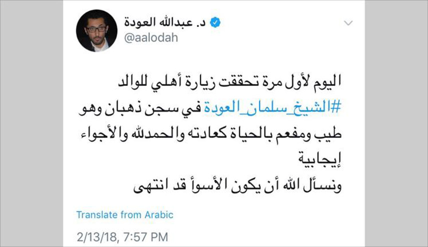 ونشر عبد الله العودة نهاية الشهر الماضي تغريدة قال فيها إن والده نقل إلى المستشفى بعدما قضى أكثر من أربعة أشهر في سجن انفرادي.