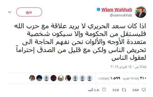 وقال وهاب في تغريدة له على صفحته على موقع "تويتر": "اذا كان سعد الحريري لا يريد علاقة مع حزب الله فليستقل من الحكومة وإلا سيكون شخصية متعددة الأوجه والألوان نحن نفهم الحاجة الى تحريض الناس ولكن مع قليل من الصدق إحتراماً لعقول الناس.