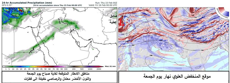 وكانت مصادر طقسية ومتنبؤن جويون اتفقوا أمس، الأربعاء، على توقعات تشير إلى تأثر منطقة شرق البحر الأبيض المتوسط وبينها العراق بمنخفض جوي عميق نهاية هذا الاسبوع على مدار ثلاثة ايام وسط دعوات لأخذ الحذر من احتمال تشكل السيول والفيضانات.