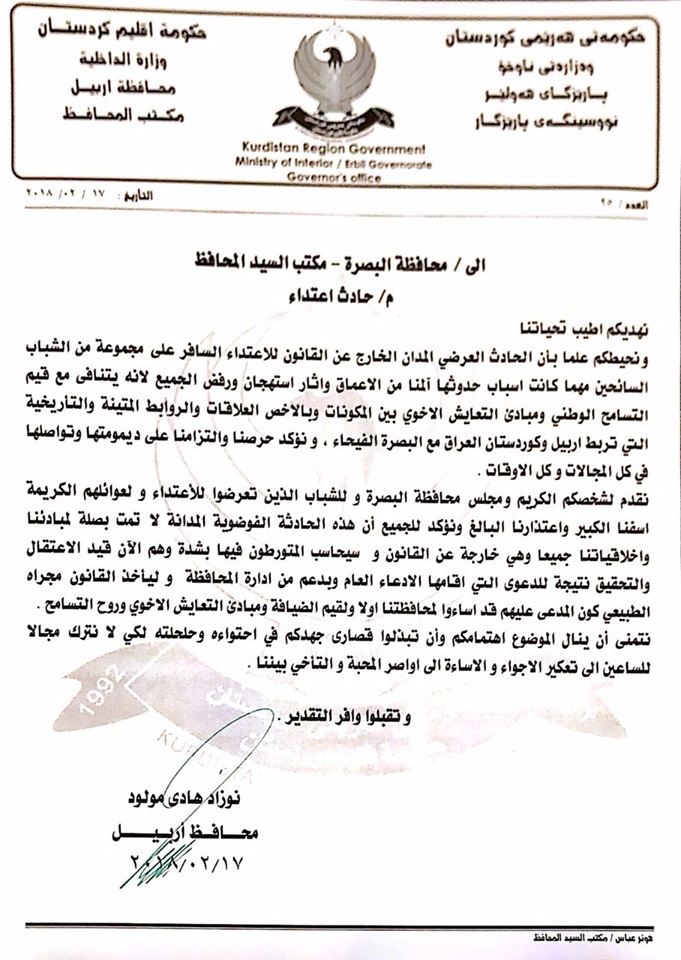 وكان محافظ أربيل، نوزاد هادي، أكد الخميس، اعتقال 12 شخصا بسبب المشاجرة التي جرت الاربعاء في إحدى متنزهات المدينة مع سياح من البصرة.