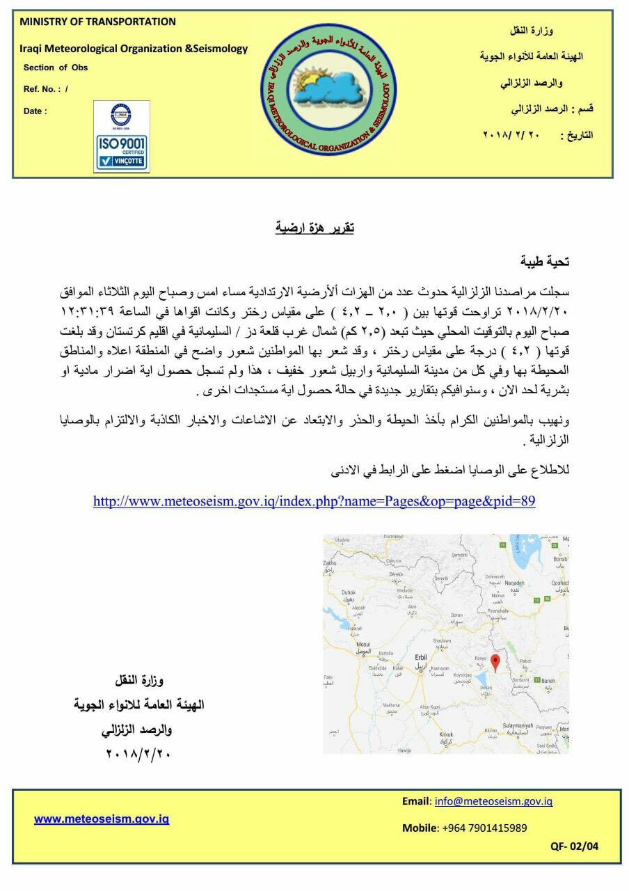واضافت الهيئة ان "الهزة تبعد (2.5 كم) شمال غرب قلعة دزة / السليمانية في اقليم كردستان وقد بلغت قوتها ( 4.2 ) درجة على مقياس رختر"، مبينا ان "المواطنين شعروا بها بشكل واضح في المنطقة اعلاه والمناطق المحيطة بها وفي كل من مدينة السليمانية واربيل شعور خفيف".