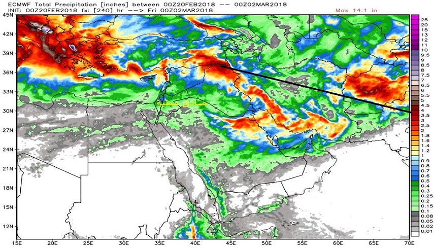 في الخارطة المرفقة، تراكم الأمطار لعشرة أيام قادمة من نموذج التنبؤات الاوربي.. حيث يشير الى فرص هطول أكبر كمية أمطار على شمال البلاد ثم بعض مناطق الشرق.