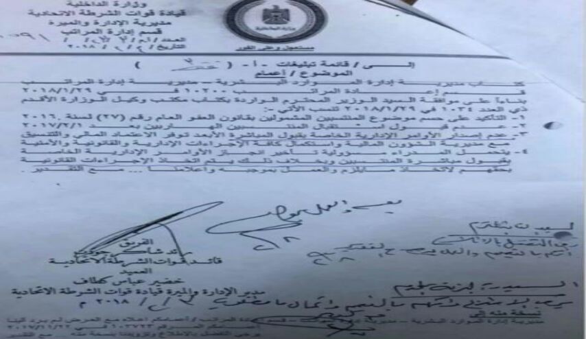وجاء في الوثيقة التي اصدرتها الوزارة عدد من النقاط تضمنت "عدم قبول استقبال المتناسبين الهاربين بعد2017/2/1، والتأكيد على حسم موضوع المنتسبين المشمولين بقانون العفو رقم 27 لسنة 2016".