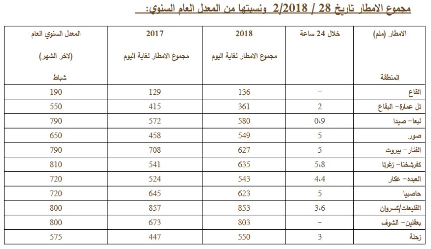 بحسب مصلحة الابحاث العالمية الزراعية فان مجموع الامطار في بيروت هذا العام حتى اليوم بلغ 627 ملم- مجموع الامطار في بيروت لغاية اليوم في العام 2017 كان 708 ملم، اذاً هناك تراجع حتى الان حوالي 81 ملم بين العام الماضي وهذا العام. اما المعدل العام في بيروت (الفنار) فهو حتى نهاية شباط 790 ملم.