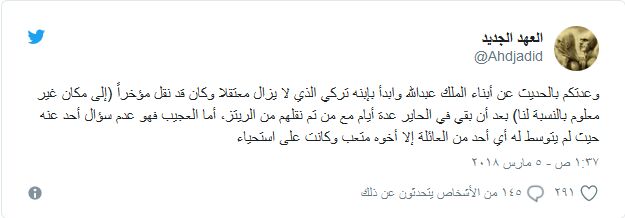 وقال “العهد الجديد” في تدوينات له عبر حسابه بموقع التدوين المصغر :”وعدتكم بالحديث عن أبناء الملك عبدالله وابدأ بإبنه تركي الذي لا يزال معتقلا وكان قد نقل مؤخراً (إلى مكان غير معلوم بالنسبة لنا) بعد أن بقي في الحاير عدة أيام مع من تم نقلهم من الريتز، أما العجيب فهو عدم سؤال أحد عنه حيث لم يتوسط له أي أحد من العائلة إلا أخوه متعب وكانت على استحياء”.