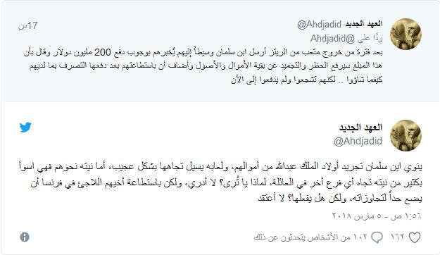 وكشف “العهد الجديد” أنه: “بعد فترة من خروج متعب من الريتز أرسل ابن سلمان وسيطاً إليهم يُخبرهم بوجوب دفع 200 مليون دولار وقال بأن هذا المبلغ سيرفع الحظر والتجميد عن بقية الأموال والأصول وأضاف أن باستطاعتهم بعد دفعها التصرف بما لديهم كيفما شاؤوا .. لكنهم تشجعوا ولم يدفعوا إلى الآن”.