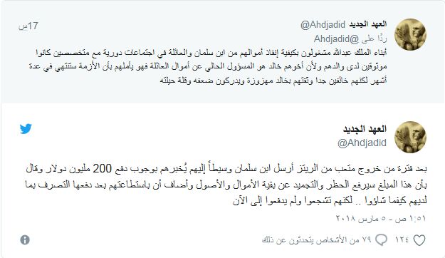 واضاف في تدوينة اخرى أن “أبناء الملك عبدالله مشغولون بكيفية إنقاذ أموالهم من ابن سلمان والعائلة في اجتماعات دورية مع متخصصين كانوا موثوقين لدى والدهم ولأن أخوهم خالد هو المسؤول الحالي عن أموال العائلة فهو يأملهم بأن الأزمة ستنتهي في عدة أشهر لكنهم خائفين جدا وثقتهم بخالد مهزوزة ويدركون ضعفه وقلة حيلته”.