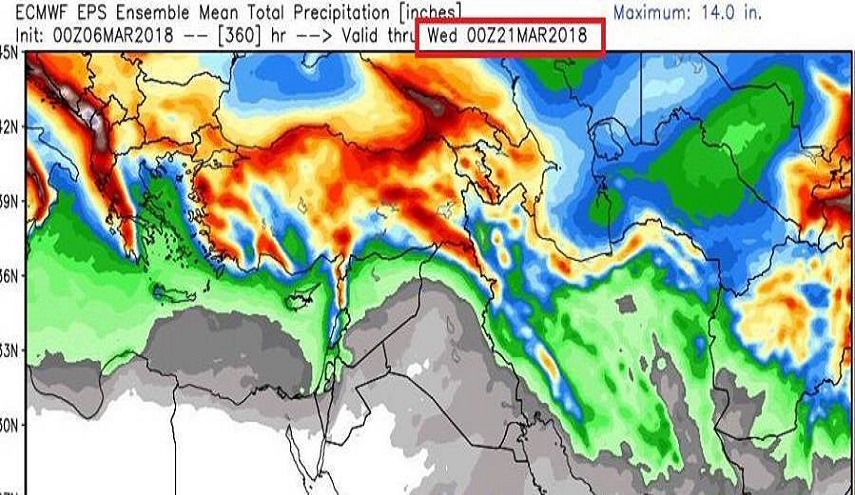 من جانب اخر اشار موديل الطقس الاوربي للامطار التراكمية الصادر قبل ايام، ان فرص الامطار لغاية الثلث الاخير من شهر اذار الحالي ستكون فقط في مدن شمال العراق وغربه.