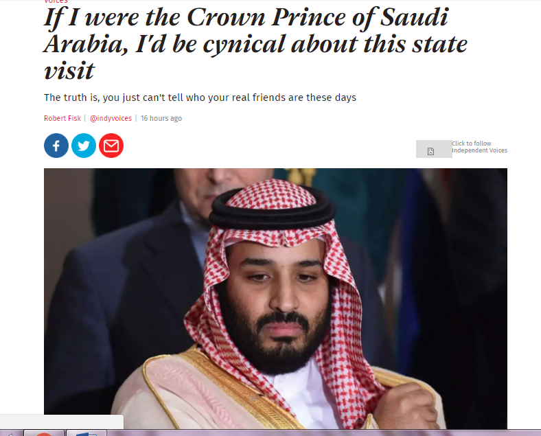 حيث قالت هذه الصحيفة البريطانية على لسان الكاتب الشهير "روبرت فيسك"، كيف يقوم شخص مثل ولي العهد العربي المتوحش بزيارة بريطانيا، بعد أن أسفرت حربه الشنيعة في اليمن عن إزهاق الآلاف من الأرواح.