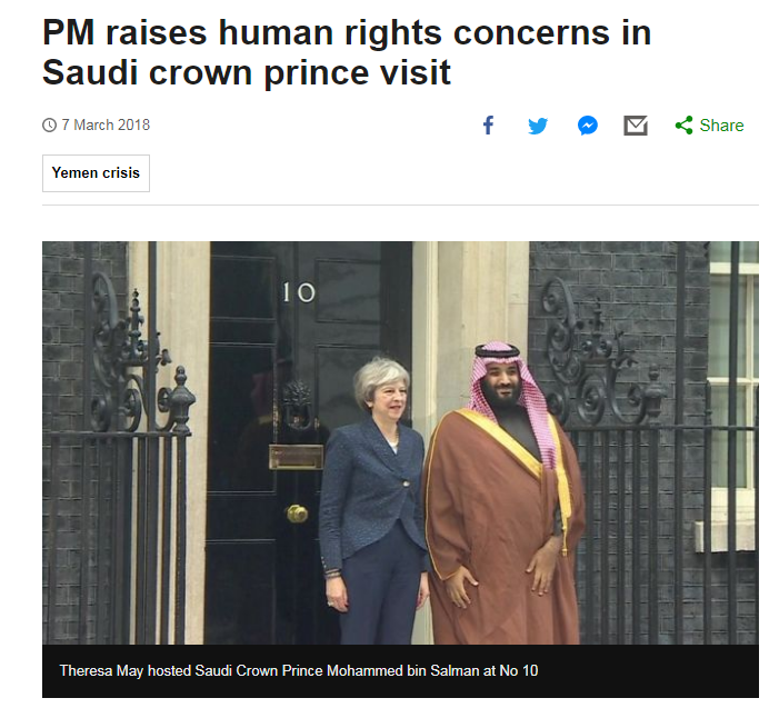 أما هيئة الإذاعة البريطانية "بي بي سي" فقد قالت على لسان الكاتبة " هولي إليات " إن ولي عهد السعودية ورئيسة وزراء المملكة المتحدة قاما بشراكة اقتصادية واستثمارية بقيمة مليارات الدولارات يوم الأربعاء. وقد أثارت زيارة ابن سلمان احتجاجات لحقوق الإنسان في لندن ناهيك عن الضغط السياسي في البرلمان.