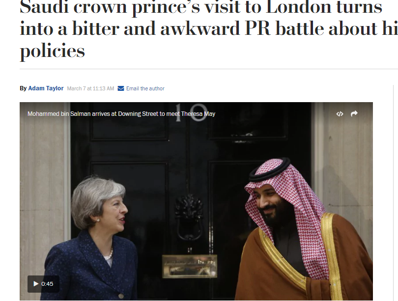 أما هذه الصحيفة الأمريكية فقد قالت إن ولي العهد السعودي الأمير محمد بن سلمان وصل إلى لندن في 7 آذار / مارس في زيارة رسمية تستغرق ثلاثة أيام، ولكن على الرغم من فرش السجادة الحمراء لاستقباله، فإن زيارة محمد بن سلمان تحولت بالفعل إلى معركة مريرة بين أولئك الذين يؤيدون التحركات التي تقوم بها للمملكة العربية السعودية وأولئك الذين يطلقون عليه "مجرم حرب"، فالسياسة الخارجية لابن سلمان باتت مثيرة للجدل في لندن، بشكل كبير.
