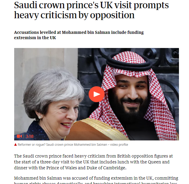 أما صحيفة الغارديان البريطانية فقد قالت على لسان الكاتب "باتريك وينتور" إن ولي العهد السعودي واجه انتقادات شديدة من قبل شخصيات المعارضة البريطانية منذ بداية زيارة استمرت ثلاثة أيام إلى المملكة المتحدة.