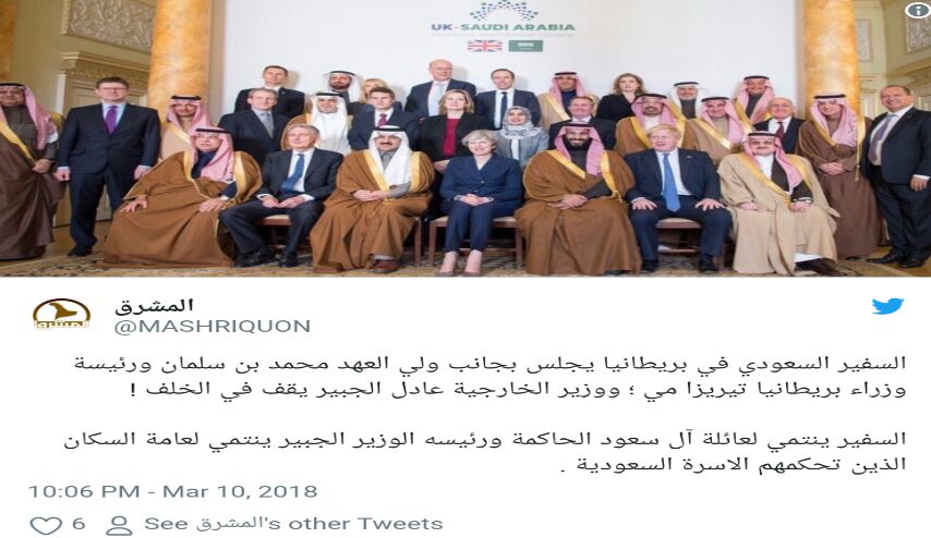 وخلافا للتقاليد والبروتوكولات الدبلوماسية، فقد أظهرت الصورة وزير الخارجية السعودي عادل الجبير واقفا خلف السفير السعودي في لندن الأمير محمد بن نواف بن عبد العزيز آل سعود في حين ظهر السفير جالسا بجانب وزير الخارجية البريطاني بوريس جونسون، خلال التقاط صورة تذكارية جمعت مسؤولين بريطانيين وسعوديين خلال زيارة ولي العهد السعودي محمد بن سلمان للمملكة المتحدة والتي انتهت السبت.