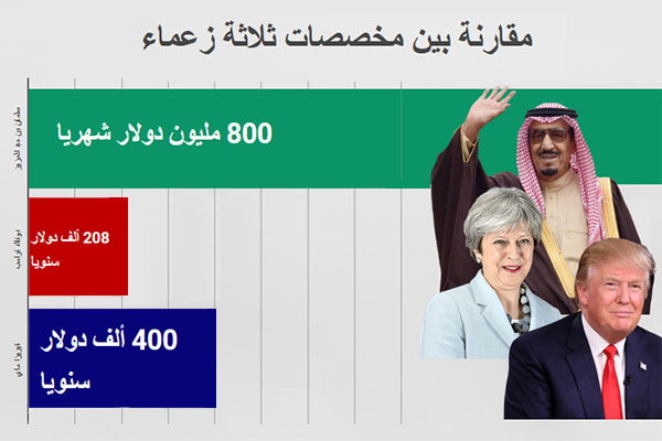 وبحسب ما كشف موقع “ميدل إيست آي” المتخصص بأخبار الشرق الأوسط والذي يبث من لندن فان الملك سلمان يتقاضى في كل شهر ألفي ضعف ما يتقاضاه ترامب في عام كامل، أما بالمقارنة مع رئيسة وزراء بريطانيا تيريزا ماي فان الهوة تزيد أكبر من ذلك بكثير.