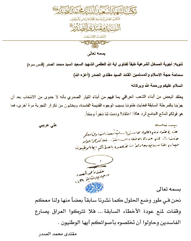وسبق أن رد الصدر في الخامس من اذار 2017، على سؤال وجه له من احد اتباعه بشأن المشاركة في الانتخابات، بالقول "أنـقـذوا العراق بأصواتكم أيها المحبون للوطن، وإلّا ضاع بأيدي الفاسدين".