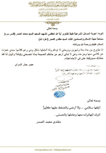 وجاء في نص جوابه على سؤال لاحد اتباع التيار الصدري يشكو له من زوجته التي لا توده قائلا "أبلغها سلامي، ولا أرضى بالضغط عليها كثيراً، وأترك المهاترات معها وعاملها بالحسنى".
