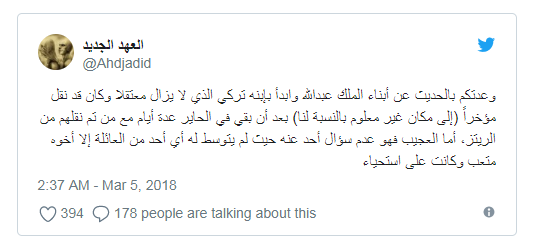 وحينها قال “العهد الجديد” في تدوينات له عبر حسابه بموقع التدوين المصغر “تويتر” رصدتها “وطن”:”وعدتكم بالحديث عن أبناء الملك عبدالله وابدأ بإبنه تركي الذي لا يزال معتقلا وكان قد نقل مؤخراً (إلى مكان غير معلوم بالنسبة لنا) بعد أن بقي في الحاير عدة أيام مع من تم نقلهم من الريتز، أما العجيب فهو عدم سؤال أحد عنه حيث لم يتوسط له أي أحد من العائلة إلا أخوه متعب وكانت على استحياء”.